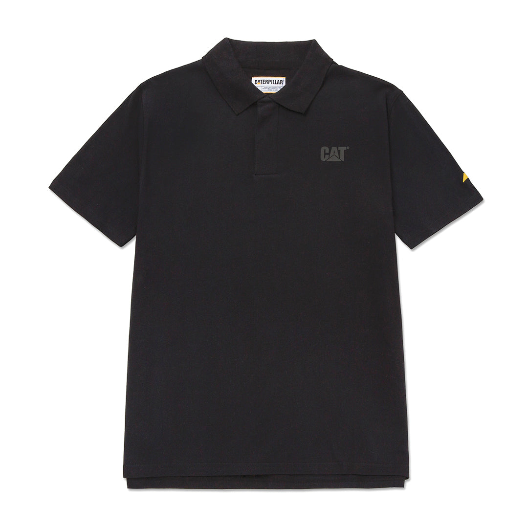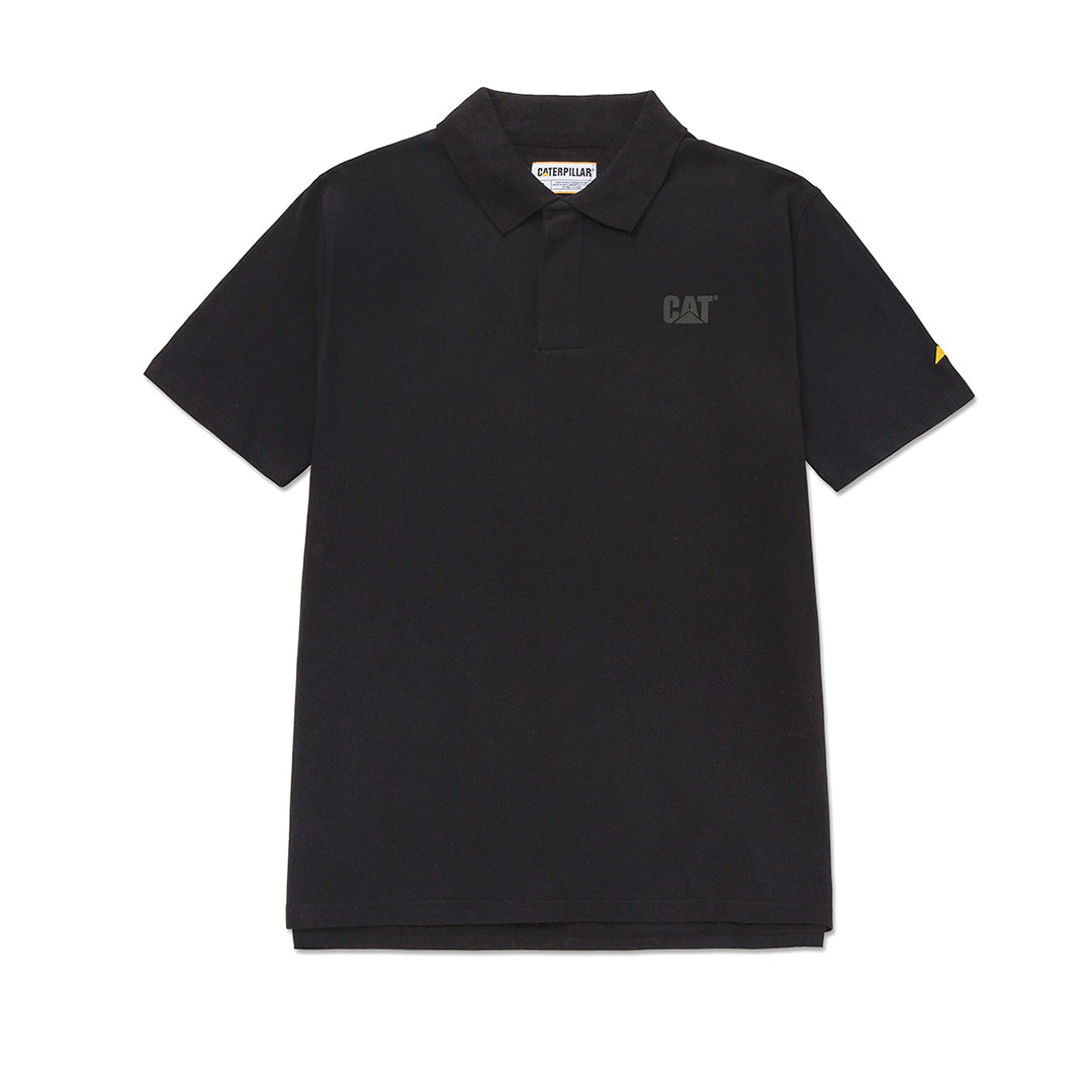 Camisa estilo polo, tela Piqué, 94% algodón, logotipo CAT estampado en el lado izquierdo del pecho, cuello de canalé de punto plano y tapeta de botones ocultos, bordado de triángulo amarillo en la manga.
