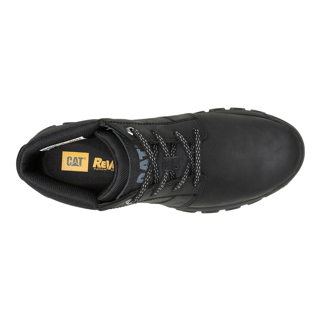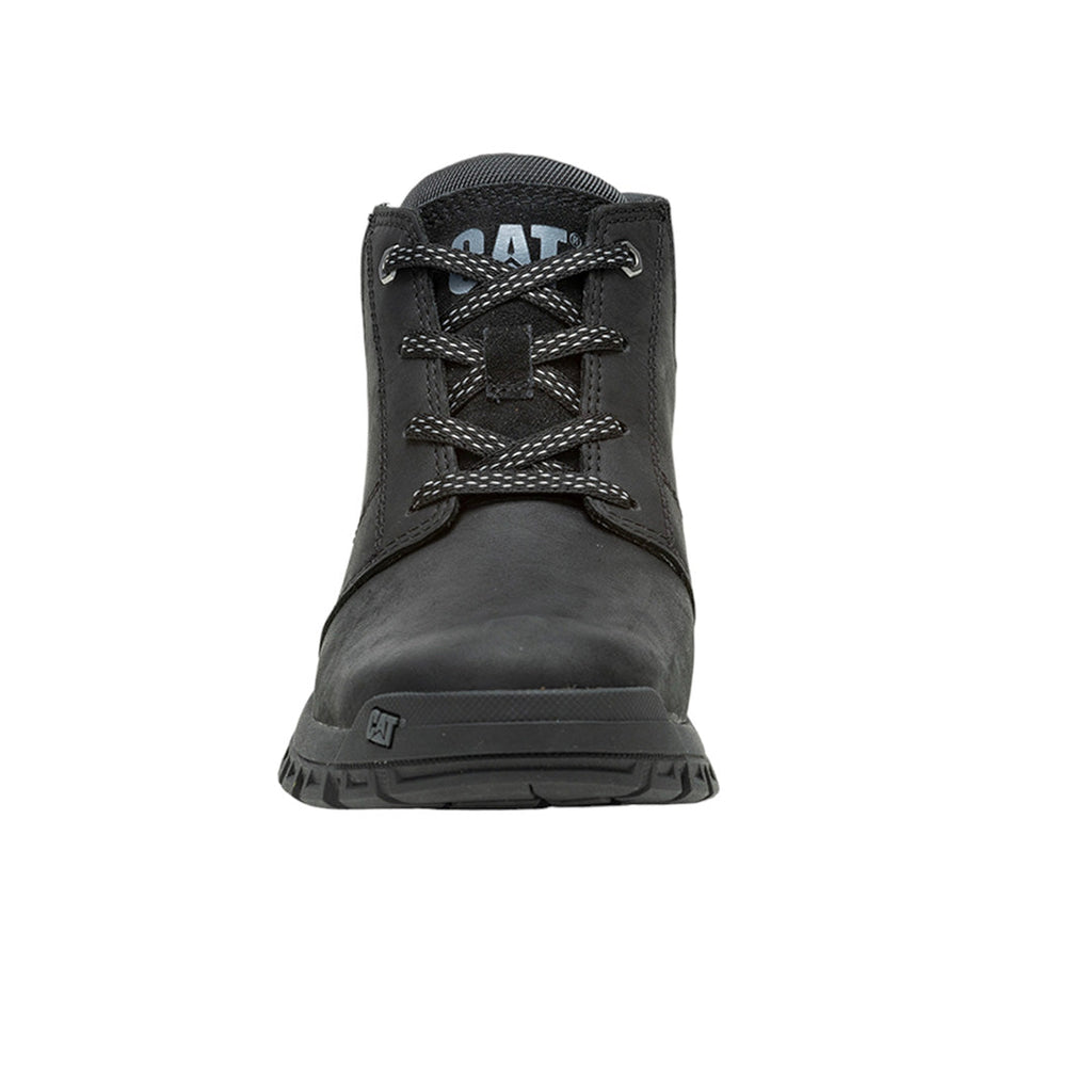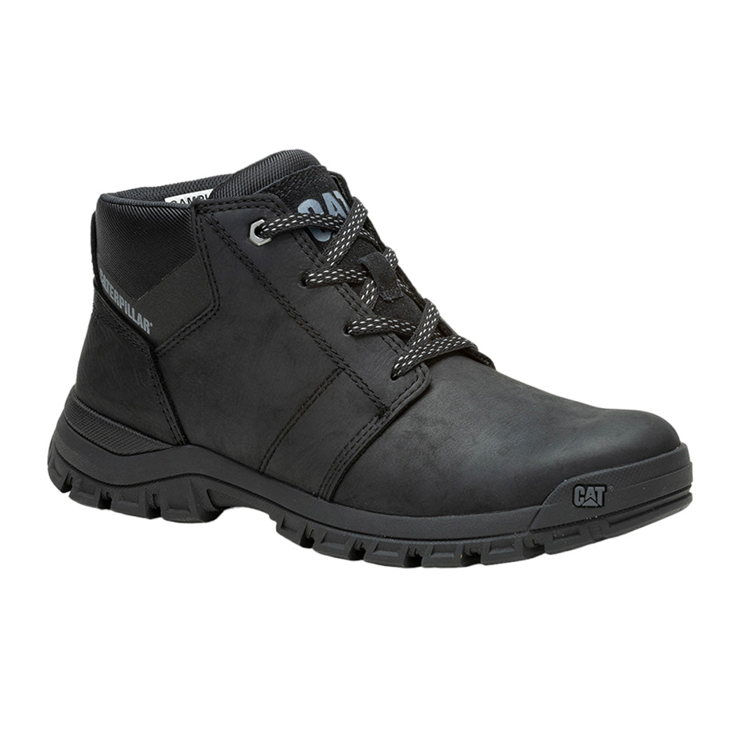 Botas CAT para hombre, color negro, elaborados en piel con fijación de agujeta, punta redonda, textura lisa y altura de suela de 3.5 cm.