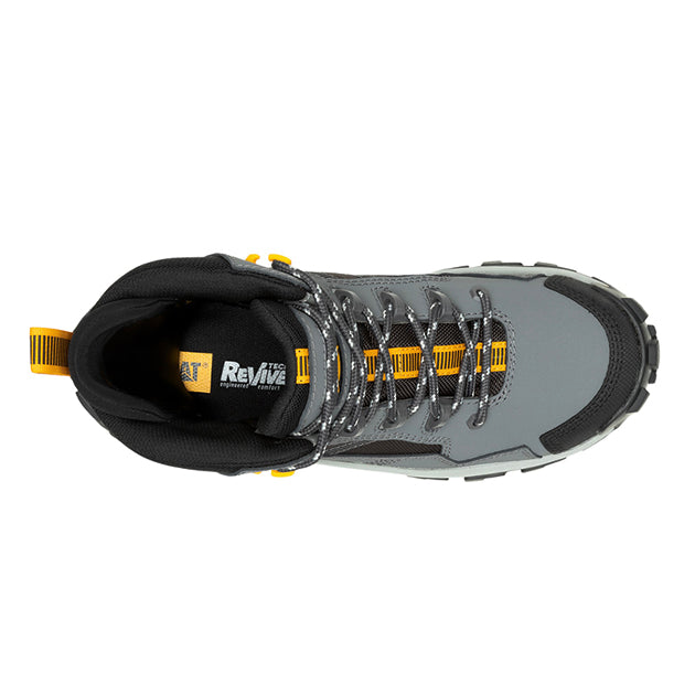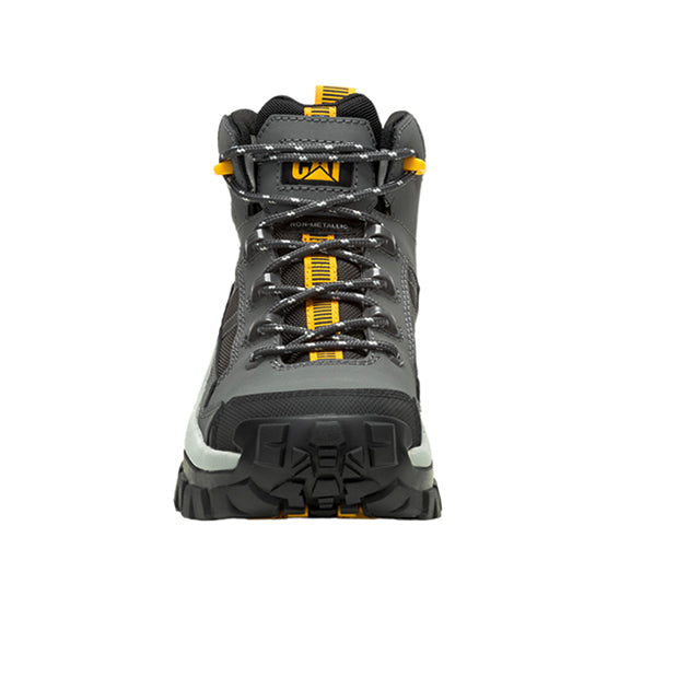 Botas industriales CAT para hombre elaborado en piel con agujetas, entresuela de EVA ultraligera/resistente, suela exterior de goma duradera para tracción con construcción strobel y altura de suela 6 cm. Cubo no metálico, 40% más liviano que el cubo de acero. Ofrece protección hasta 14,000 voltios en condiciones secas.
