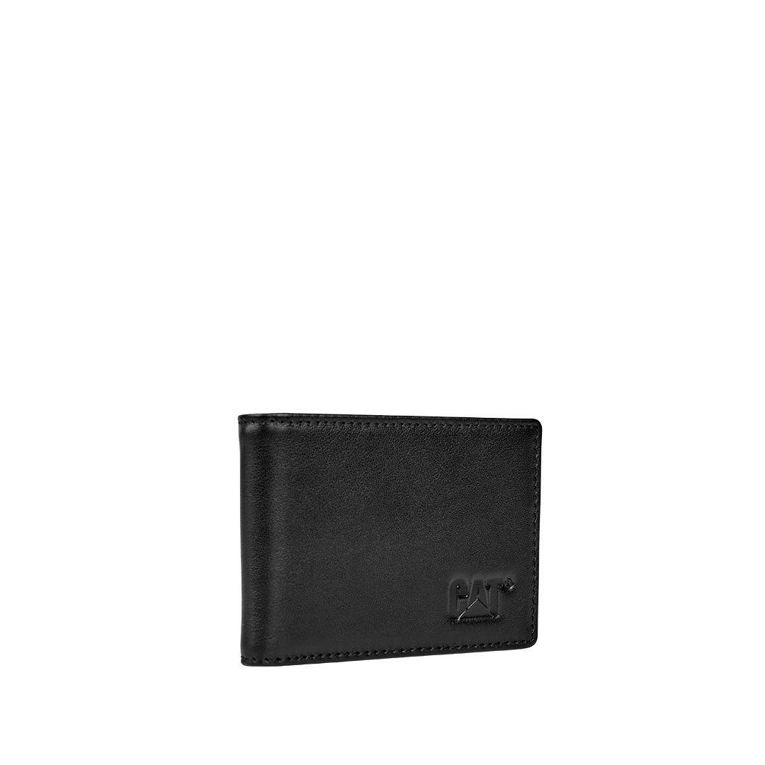 Billetera bifold marca Caterpillar de cuero premium con clip para billetes, capacidad para hasta 4 tarjetas de crédito. Sus medidas son 11 x 8 x 1.5 cm, con volumen 0 L y peso de 0.06 kg, fabricada en cuero de primera calidad (top grain leather).