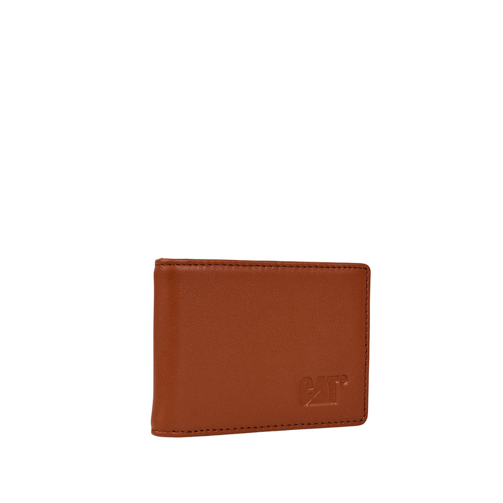 Billetera bifold marca Caterpillar de cuero premium con clip para billetes, capacidad para hasta 4 tarjetas de crédito. Sus medidas son 11 x 8 x 1.5 cm, con volumen 0 L y peso de 0.06 kg, fabricada en cuero de primera calidad (top grain leather).