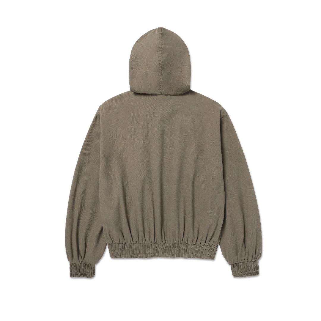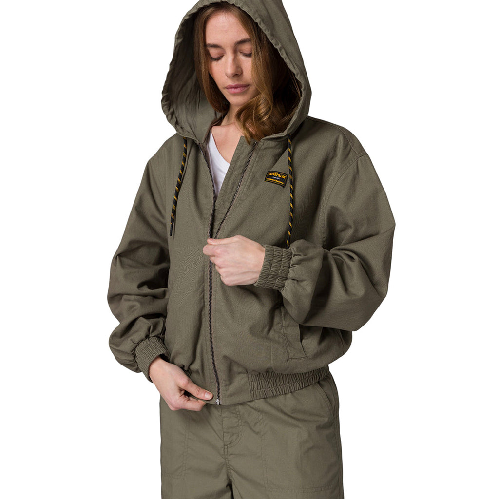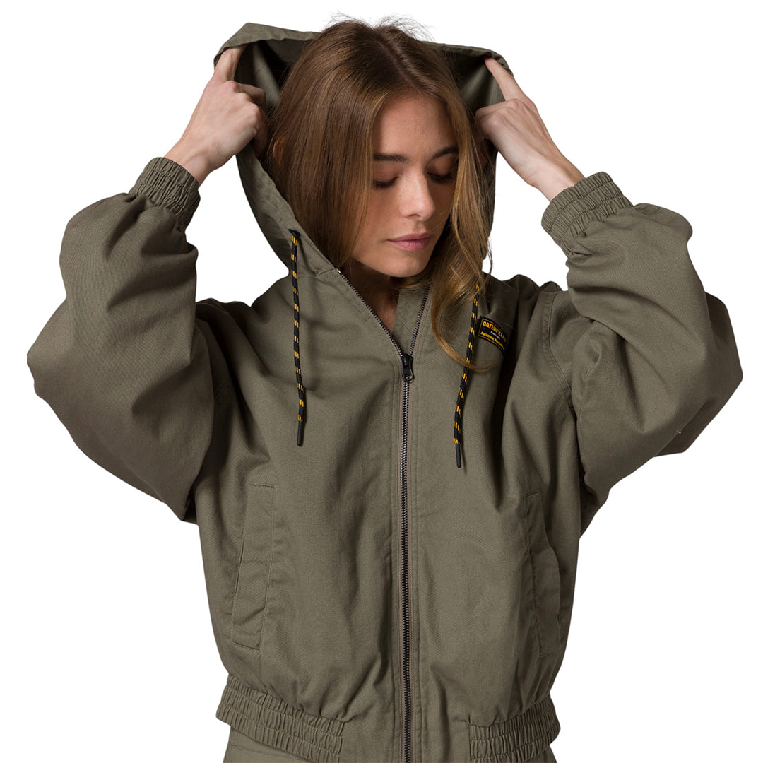Jacket Bomber ligera, corte cropped tipo bubble y detalles elásticos en puños y cintura para mayor libertad de movimiento, rematada con etiqueta Caterpillar® en el pecho y cordón con rayas de tipo ticking.
