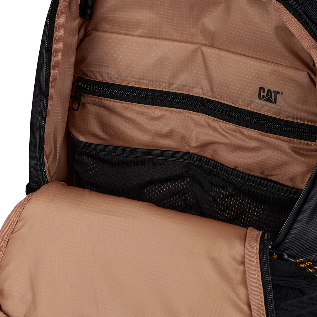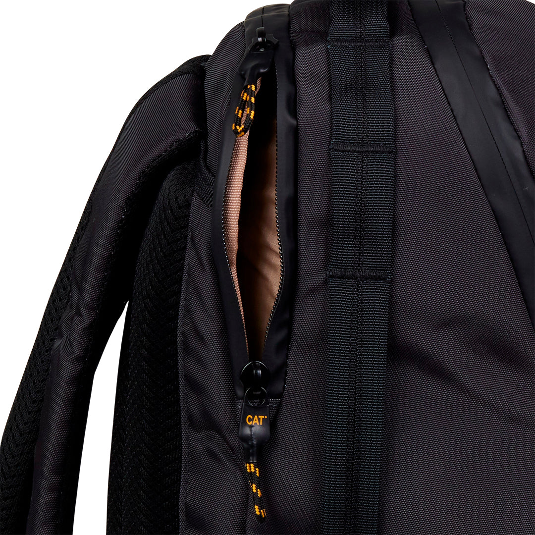Mochila Caterpillar en RPET 900D con recubrimiento PU, con base resistente al agua y cierres impermeables. Incluye compartimento acolchado para laptop, organizador interno, bolsillo frontal con cierre magnético oculto, bolsillo secreto trasero y pasador para trolley. 30 × 46 × 16 cm, 19 L, 0.755 kg.